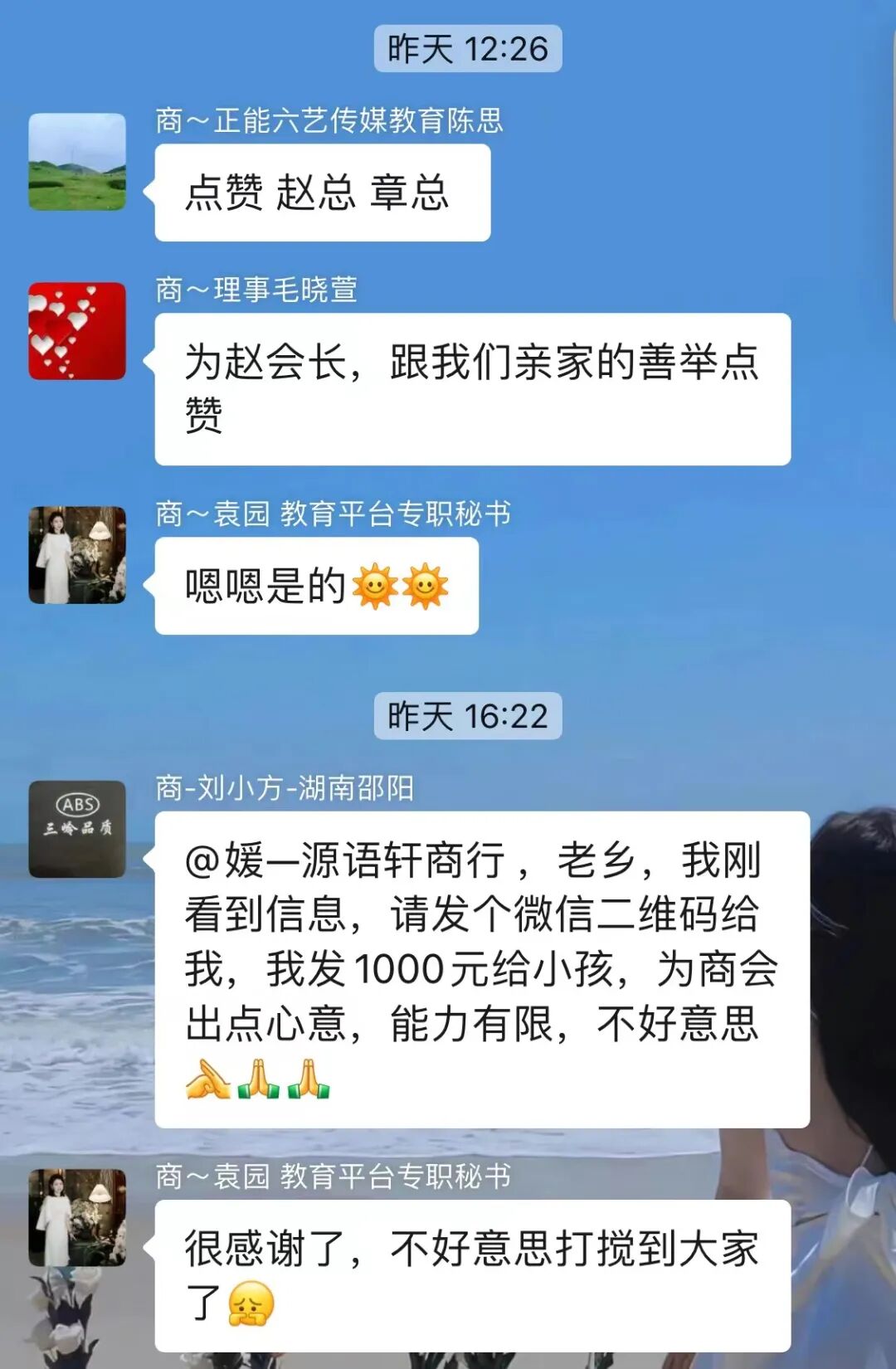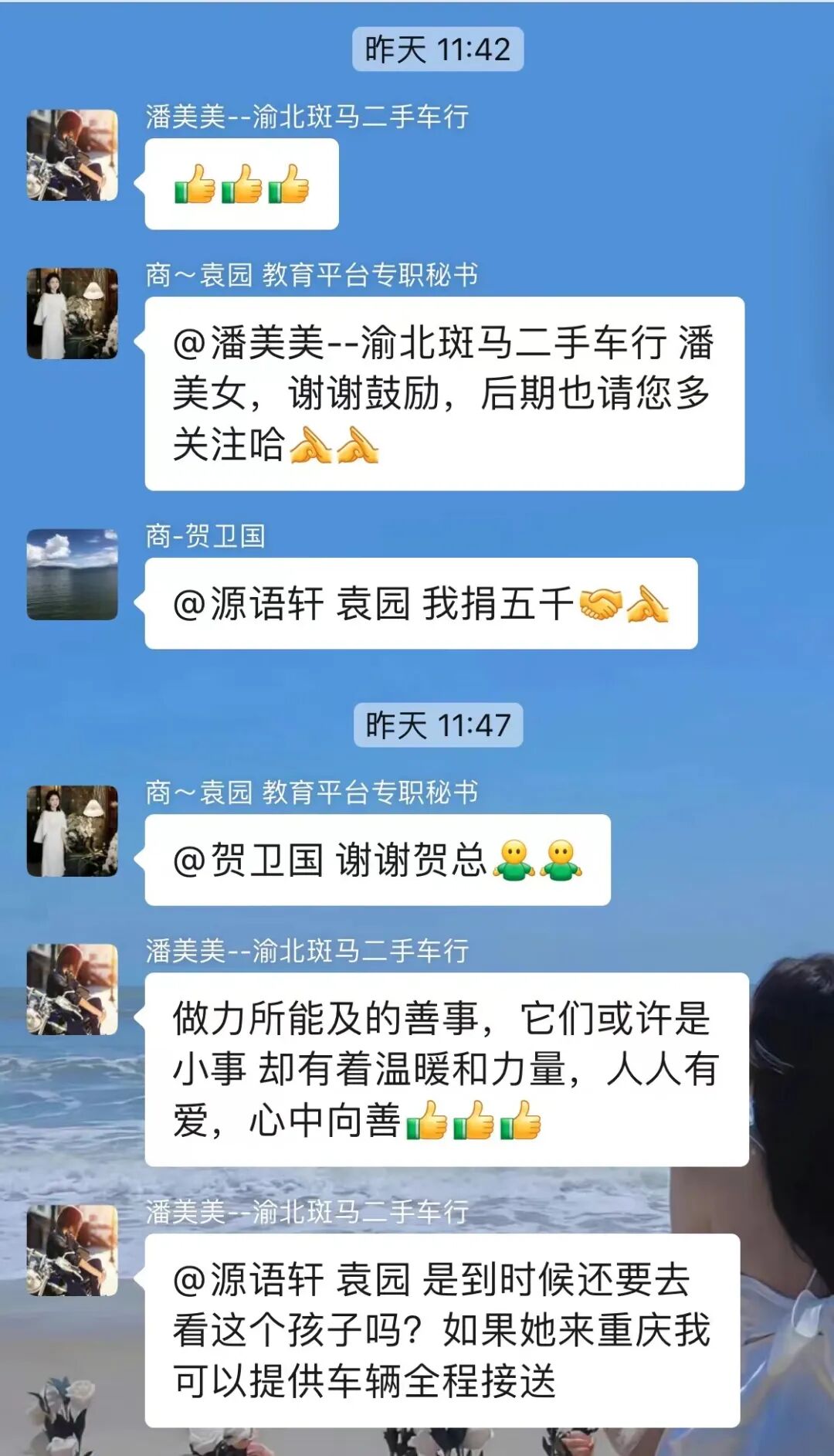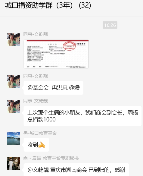 理事章剑锋先生当场捐赠1万元,赵宗伯捐赠1千元。在理事袁园女士的呼吁下,商会常务副会长贺卫国捐赠5千元,副会长周扬捐赠1千元、肖阳捐赠1千元,理事潘美美承诺小徐同学来重庆检查身体时提供全程车辆接送服务,会员刘小方捐赠1千元,社会爱心人士唯唯捐赠5千元。短短两天时间内城口教育基金会已筹集到“山树之光”医疗救助和助学资助捐赠资金 2 万多元,小徐同学将不会因病辍学,为他们的大爱之举点赞。