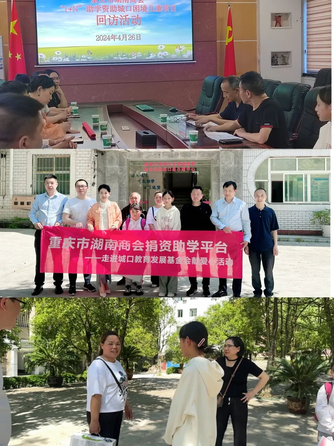 4月26日一早,商会副会长赵宗伯、理事兼捐资助学平台秘书袁园、理事章剑锋、优秀湘籍老乡付优文组成慰问团,在会长周英及常务副会长兼捐赠助学平台负责人刘吉民的授意下,代表商会捐资助学平台及城口县31个爱心孤儿近20位捐赠人的意愿,赴大巴山深处城口县开展捐资助学回访活动。