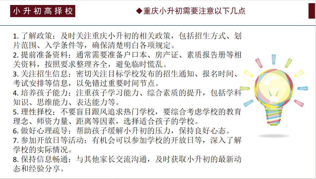 讲座中,陈老师重点围绕高校招生的各类政策、升学途径、注意事项以及中考联招与非联招的区别、考试范围、名校特色、学生职业规划、就业前景等内容进行了深入解读,助力会员家庭规划孩子升学之路,营造积极学习氛围。