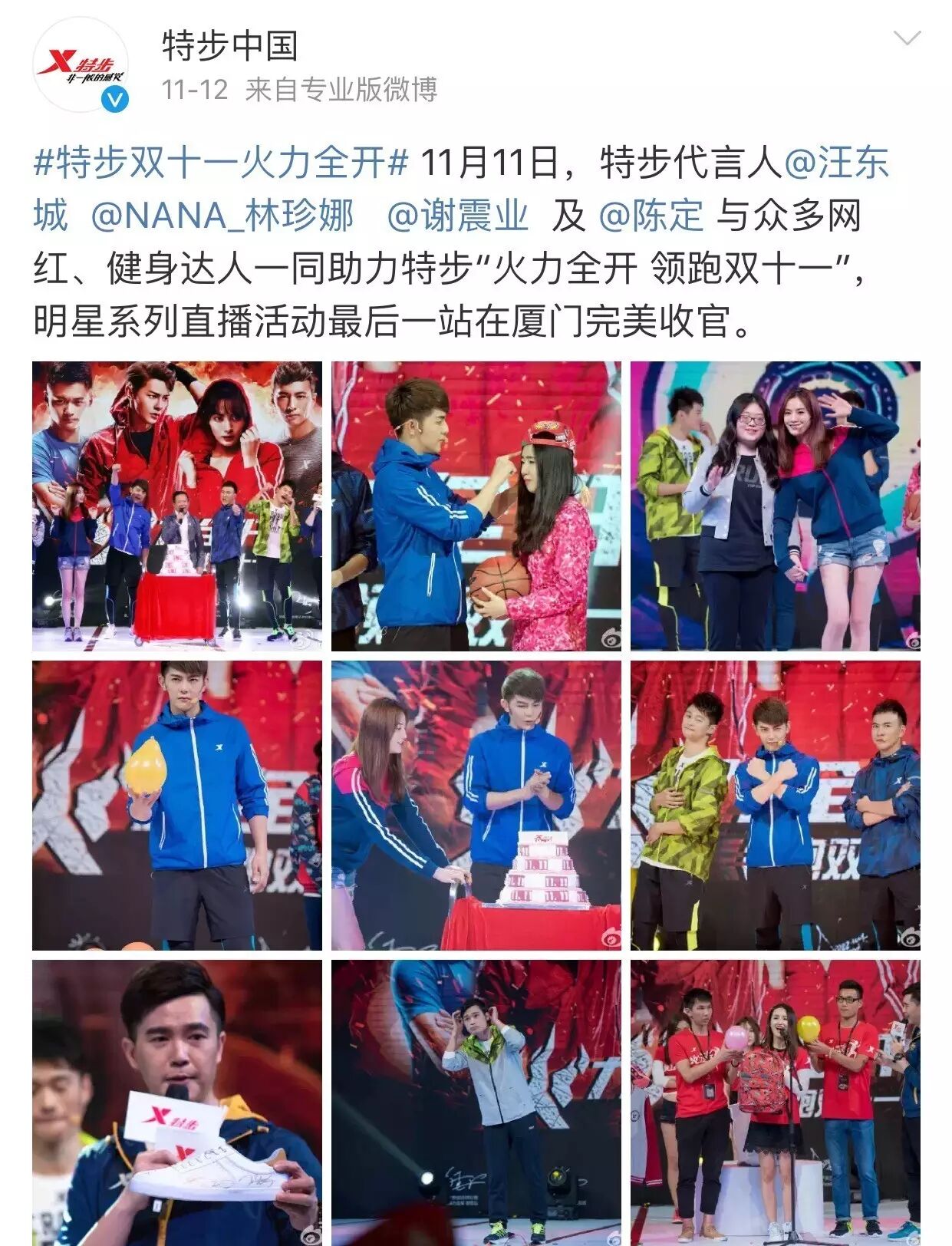 11月1日,安踏携手奥运拳击冠军邹市明和中国足球名将郑智上直播,吸引观众看直播赢取红包,为“双十一”营造声势。特步继去年赞助天猫“双十一”晚会后,今年策划了“火力全开、领跑‘双十一’”主题系列营销活动,通过线上线下融合的方式,邀请品牌形象代言人汪东城、李易峰,体育明星林珍娜连续举办四场直播活动,为“双十一”的销售助力。而361度体育的直播采取的则是素人策略,在北京举行预热直播活动,现场派发价值20万元的购物券及红包现金,同时在361度年轻粉丝中挑选主播,这些草根主播的穿着成为同步上线的产品。