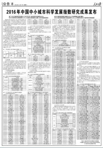 11月7日,中小城市经济发展委员会、中小城市发展战略研究院、中国中小城市科学发展指数研究课题组等单位通过《人民日报》和《2016中国中小城市发展报告·绿皮书》联合发布了第十二届中国中小城市科学发展指数研究成果。