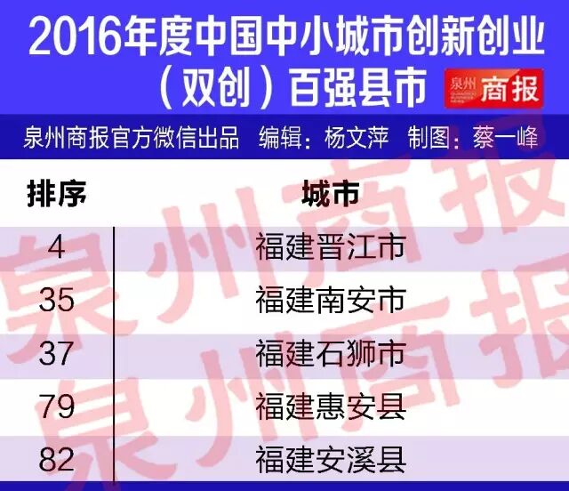 在2016年度中国中小城市创新创业(双创)百强县市中,泉州5县市上榜,分别是:晋江市、南安市、石狮市、惠安县、安溪县。