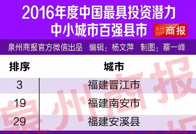 在全国最具投资潜力百强县市中,泉州3县市上榜,分别是:晋江市、南安市、安溪县。晋江市排名保持不变,南安市、安溪县排名均上升两位。