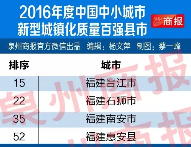 在2016年度中国新型城镇化质量百强县市中,泉州4县市上榜,分别是:晋江市(第15名,排名与去年保持不变)、石狮市(第22名,比去年排名上升1位)、南安市(第35名,比去年排名上升2位)、惠安县(第52名,比去年排名上升2位)。