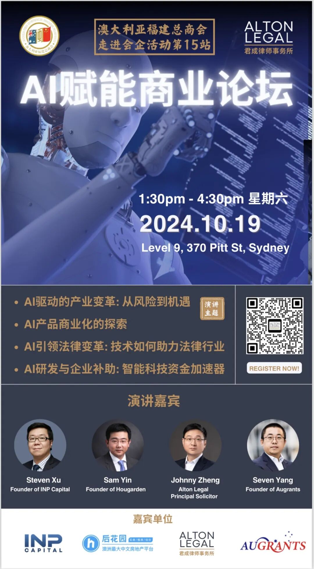 10月19日,澳大利亚福建总商会即将举行福建总商会“走进会企”第十五站Alton Legal澳洲君成律师事务所暨会员大会。本次活动以“AI赋能商业论坛”为核心主题,旨在探索人工智能如何重塑商业版图,引领未来经济新航向。